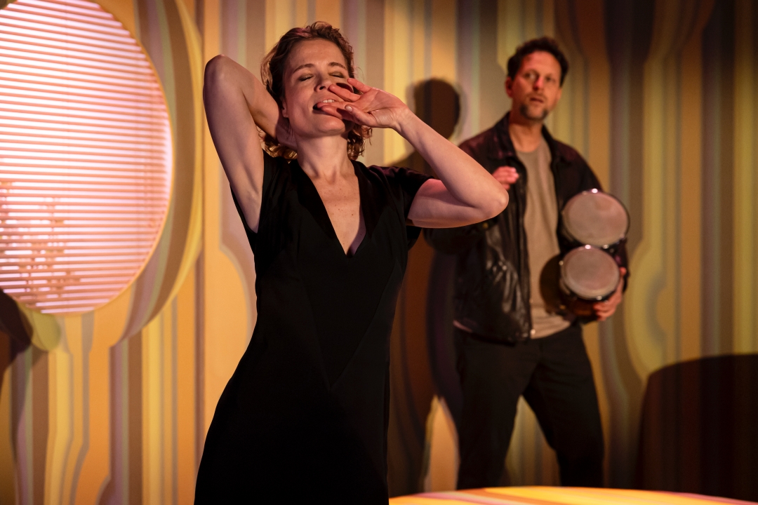 La scénographie de Jean-Michel Adam suscite des interrogations. Avec ses formes rondes et asymétriques, le décor peine à trouver une identité propre, nous plongeant dans un ailleurs nébuleux qui dessert l’intrigue. Cet espace indéterminé efface l’indispensable hors-champ, privant la pièce de toute profondeur et le couple de l’indispensable tiers. Les tons jaunes sont supposés évoquer le cocufiage ? Pourquoi pas. Mais l’esthétique, dans tous les cas, heurte le regard. Quant à la lumière de Didier Brun, elle semble chercher à fuir le décor, intensifiant les jeux d’ombres et de lumières comme pour s’échapper de cet environnement.