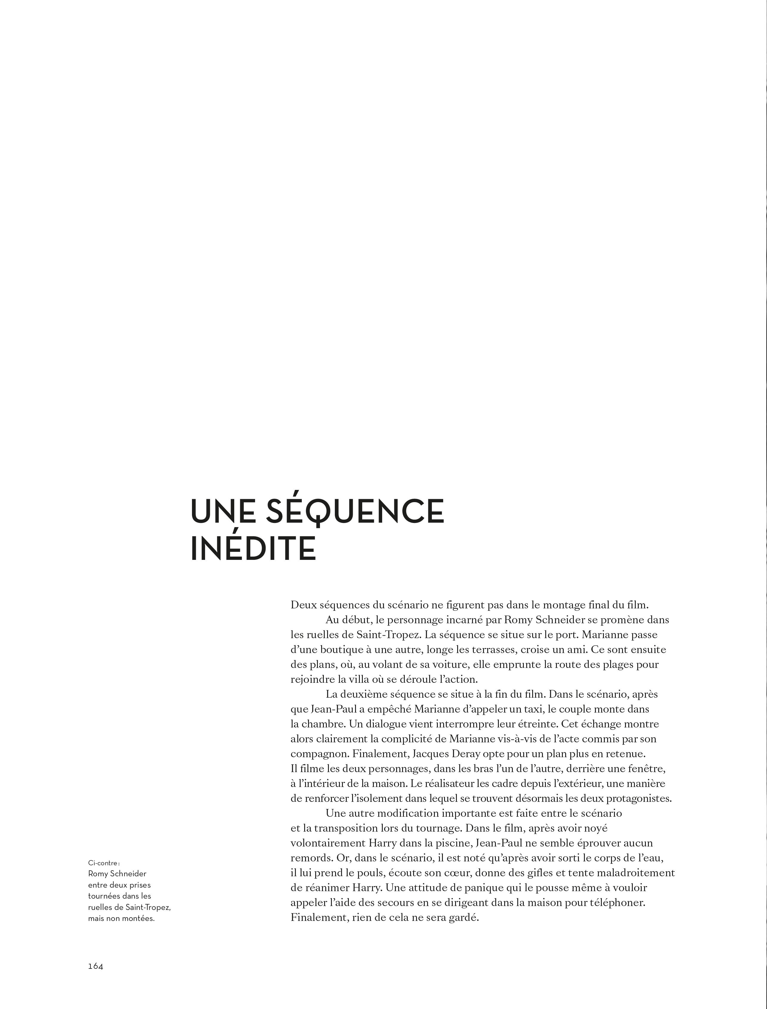 En effet, découpé en trois étapes que sont la préparation, le tournage et les retombées du film, le livre présente l'intégralité de son historique. Il est particulièrement intéressant d'y retrouver un focus sur Romy Schneider, notamment sur le célèbre couple cinématographique qu'elle forme avec Alain Delon ainsi que leurs échanges en tant qu'anciens amants.