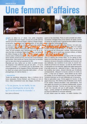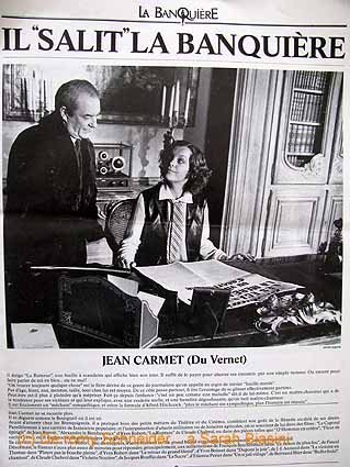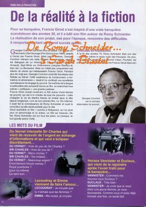A la fin des années 1960, Dominique Desanti ressuscite dans une biographie Marthe Hanau, la «banquière des Années folles». Cette femme scandaleuse par ses escroqueries et ses moeurs saphiques attire les actrices : Jeanne Moreau, Régine, Simone Signoret... En 1980, Romy Schneider, au sommet de sa beauté et de son talent, devient Marthe, appelée ici Emma Eckhert : elle séduit, elle triche, elle perd, sur un scénario de Georges Conchon qui prend des libertés avec l'histoire, surtout à la fin (Marthe Hanau se tua en prison). Autour de la star, Girod rassemble une brillante distribution. A part Jean-Claude Brialy en avocat truculent, c'est un fantastique défilé de crapules. Jean-Louis Trintignant représente la banque, Claude Brasseur et son greffier Jean-Michel Ribes la justice, Hubert Deschamps la police, Jean Carmet la presse pourrie. Du côté des dames, la lumineuse MarieFrance Pisier et Isabelle Sadoyan en religieuse à cornette incarnent la compassion, face aux mégères Annie Savarin et Marie-Pierre Casey. Le réalisateur choisit aussi des débutants prometteurs. Thierry Lhermitte est le factotum, Daniel Mesguich l'amant «candidat des gauches», Daniel Auteuil l'opportuniste, Philippe Brizard et Jean-Paul Muel les notaires vendus. Sans oublier Véronique Genest en femme de ménage ! Pour pimenter le tout, des écrivains affrontent la caméra. Noëlle Chatelet et Régine Deforges succombent aux charmes d'Emma, François-Régis Bastide et Guillaume Hanoteau sont des ministres corrompus, Conchon luimême arbore la moustache d'Aristide Briand.