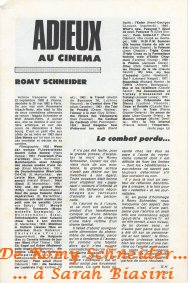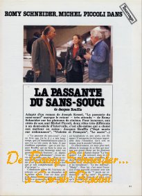 Joseph Kessel, Jacques Rouffio, Romy Schneider, Michel Piccoli. Le consortium de la qualité, de « la belle ouvrage ». Kessel n’est plus là pour juger de l’adaptation cinématographique, par Jacques Ruffio, de « La passante du Sans-souci », un livre écrit en 1937. Mais je crois qu’il n’aurait pas renié cette adaptation libre, prolongeant une histoire commencée il y a près de 50 ans, dans les rues de Berlin, quand résonnaient les bottes des assassins. L’idée de porter à l’écran ce roman un peu oublié appartient à Romy Schneider qui, à cette occasion, a retrouvé son complice Piccoli. C’est leur sixième film ensemble.