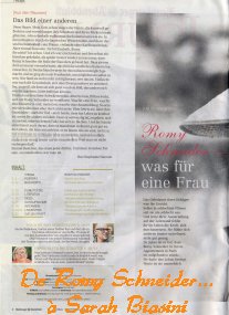 «Romy ist die projektierte Verkörperung aller deutschen Frauenklischees der Nachkriegs-Jahrzehnte: von der Jungfrau über das Luder bis hin zur reuigen Mutter. Das hatte auch sie selbst klarsichtig erkannt und immer wieder versucht, sich davon zu befreien», notiert ihre Biografin Alice Schwarzer. Schneider bekennt sich im Magazin «Stern» öffentlich zu einer damals in Deutschland verbotenen Abtreibung oder lässt Nacktfotos im «Playboy» drucken. Auch ihre Tabletten- und Alkoholsucht dringt an die Öffentlichkeit.