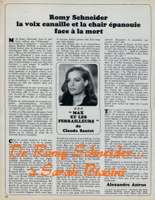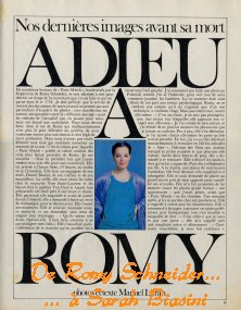 Je te regarde dormir. On me dit que tu es morte. Je pense à toi, à moi, à nous. De quoi suis-je coupable ? On se pose cette question devant un être que l'on a aimé et que l'on aime toujours. Ce sentiment vous inonde, puis reflue et puis l'on se dit que l'on n'est pas coupable, non, mais responsable... Je le suis. A cause de moi, c'est à Paris que ton cœur, l'autre nuit, s'est arrêté de battre. A cause de moi parce que c'était il y a vingt-cinq ans et que j'avais été choisi pour être ton partenaire dans «Christine». Tu arrivais de Vienne et j'attendais, à Paris, avec un bouquet de fleurs dans les bras que je ne savais comment tenir. Mais les producteurs du film m'avaient dit : «Lorsqu'elle descendra de la passerelle, vous vous avancerez vers elle et lui offrirez ces fleurs». Je t'attendais avec mes fleurs, comme un imbécile, mêlé à une horde de photographes. Tu es descendue. Je me suis avancé. Tu as dit à ta mère : «Qui est ce garçon ?». Elle t'a répondu : « Ce doit être Alain Delon, ton partenaire... ». Et puis rien, pas de coup de foudre, non. Et puis, je suis allé à Vienne où l'on tournait le film. Et là, je suis tombé amoureux fou de toi. Et tu es tombée amoureuse de moi. Souvent, nous nous sommes posés l'un à l'autre cette question d'amoureux : «Qui est tombé amoureux le premier, toi ou moi ?». Nous comptions : «Un, deux, trois !» et nous répondions : «Ni toi, ni moi ! Ensemble !». Mon Dieu, comme nous étions jeunes, et comme nous avons été heureux. A la fin du film, je t'ai dit : «Viens vivre avec moi, en France» et déjà tu m'avais dit : «Je veux vivre près de toi, en France». Tu te souviens, alors ? Ta famille, tes parents, furieux. Et toute l'Autriche, toute l'Allemagne qui me traitaient... d'usurpateur, de kidnappeur, qui m'accusaient d'enlever «l'Impératrice» ! Moi, un Français, qui ne parlais pas un mot d'allemand. Et toi, Puppelé, qui ne parlais pas un mot de français.
