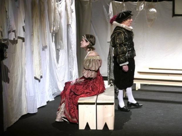 On est dans l’Italie de «la Dolce vita» de Fellini, dans le « Mariage à l'italienne » de Vittorio de Sica, «Le lit conjugal» de Marco Ferrerro... Les époques s'enchevêtrent et les costumes des comédiens s'interchangent, tantôt élisabethains tantôt modernes (costumes Dominique Bourde).