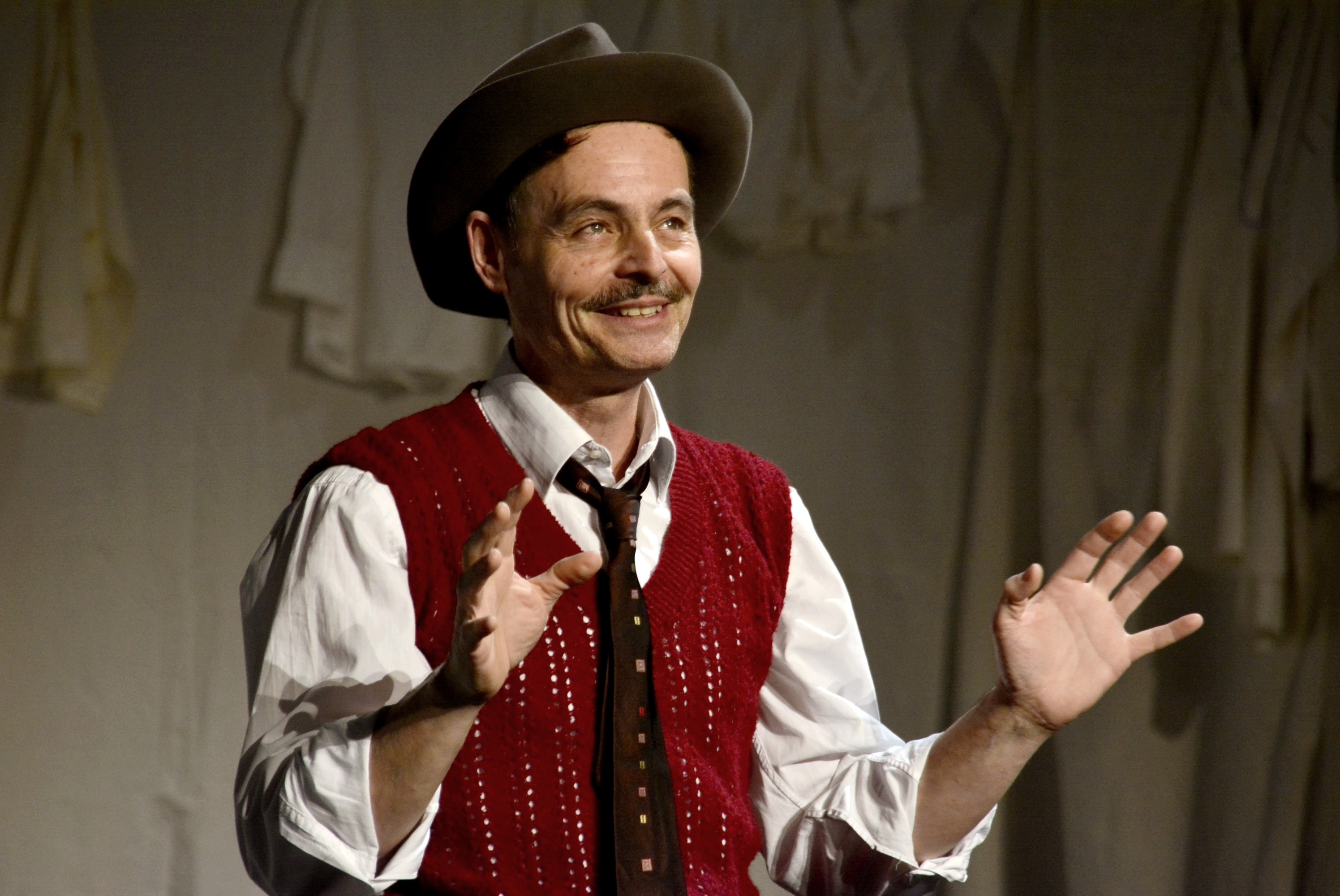 Des bancs de bois alignés de part et d'autre et les uns derrière les autres semblent prolonger les gradins de l'Artistic Théâtre nous rendant spectateurs d'un cinéma ambulant trônant sur une petite place éclaboussée de soleil et ceinte de palissades de draps immaculés sur lesquelles sont épinglées chemises, combinaisons blanches comme neige (chaude et lumineuse scénographie de François Cabanat) et d'où surgiront les comédiens.